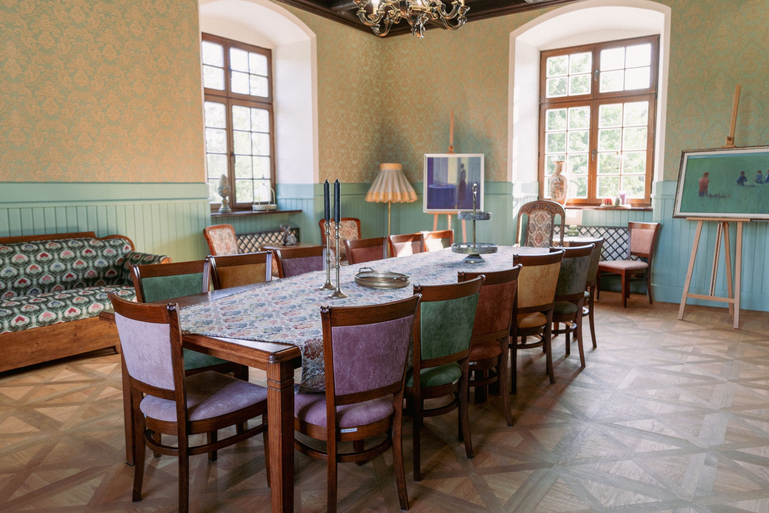 Sala królewska Sala o charakterze kameralnym (52m2 pow.), wyposażona w duży stół gościnny wraz ze stylizowanymi krzesłami. Zwykle wykorzystywana jako sala, w której serwowane są posiłki. Mieści do 50 osób. [Show slideshow]